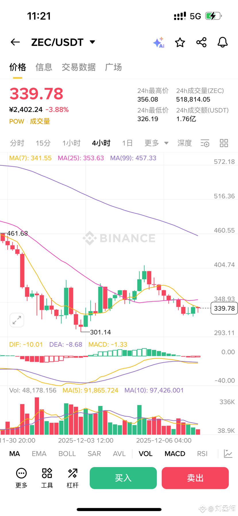ZEC/USDT 的价格在 340 美元附近来回震荡,成交量也显得稀薄。技术指标上,MA 均线空头排列,MACD 虽有小幅金叉但依旧在零轴下方运行,整体依旧笼罩在下跌趋势中。24 小时成交量不过五万多枚,与其“隐私龙头”的名号似乎不太相称。这种不温不火的走势,像极了暴风雨前的平静——市场在等待,筹码在交换,一场真正的方向选择即将到来。