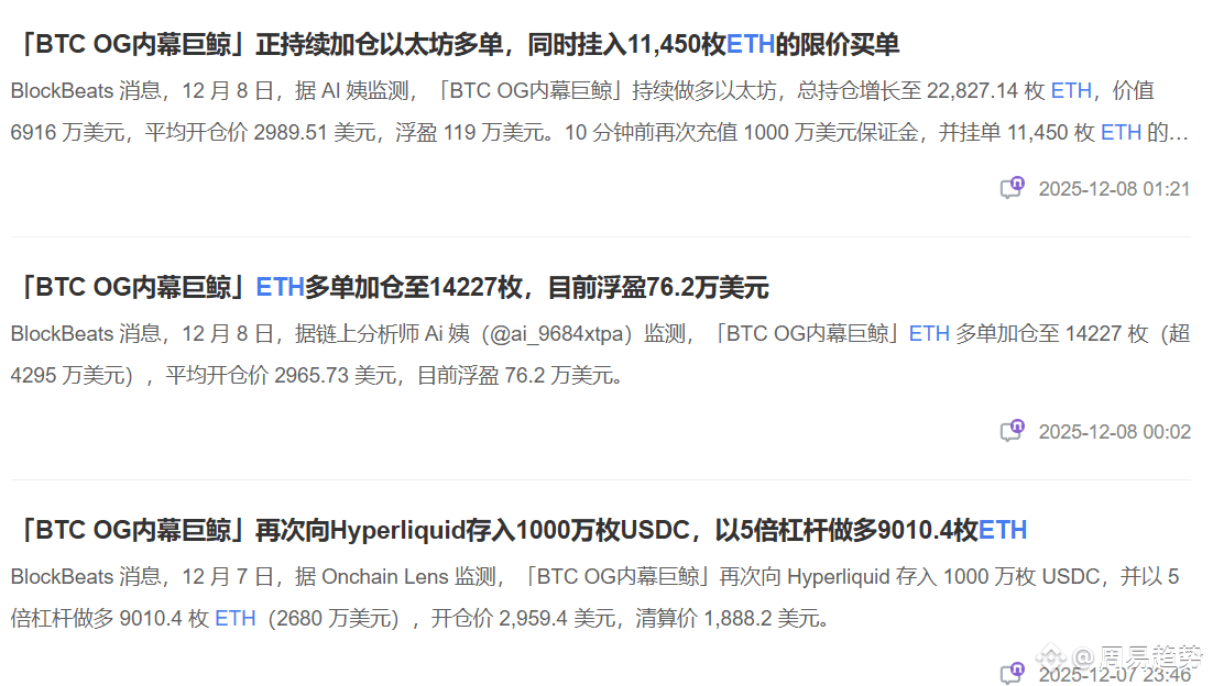 这头巨鲸不是第一次出手,从12月7号开始就持续加多,平均开仓价在2965–2989美元之间。昨晚又充值1000万USDC,挂单11450枚ETH限价买单,摆明是要在低位继续吸筹。大资金动向往往预示方向,这一点必须重视!