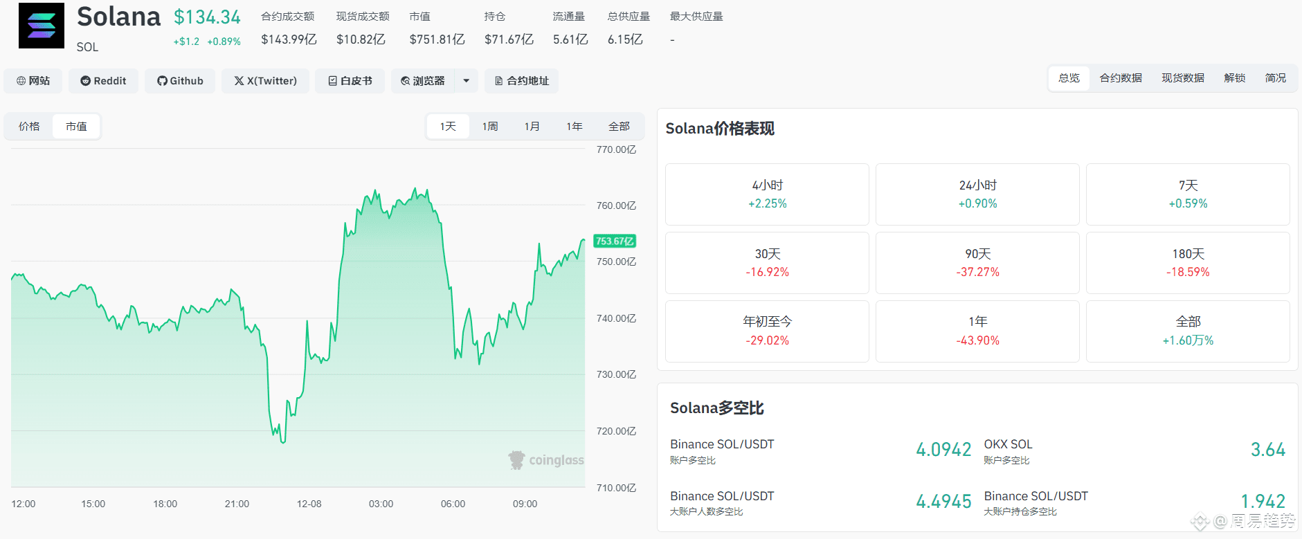 链上数据不会骗人。当前SOL多空比严重偏向多头,尤其是大客户仓位,明显在低位布局。虽然90天跌了37%,但4小时与24小时已转涨,说明短期买盘正在介入。总市值仍超140亿,稳居前五,底子还在——跌多了,反而是机会。