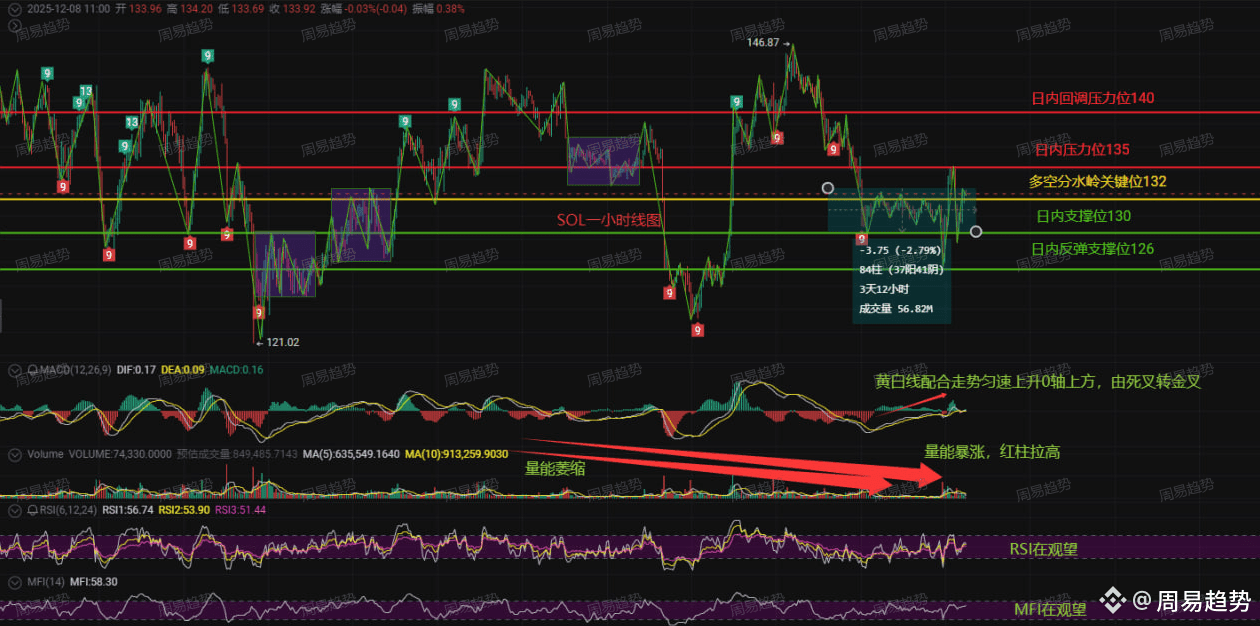 1小时图显示,SOL当前在133.9附近震荡,正好卡在多空分水岭132之上。MACD在0轴下方已死叉转金叉,白黄线匀速向上,这是短线转强信号。
