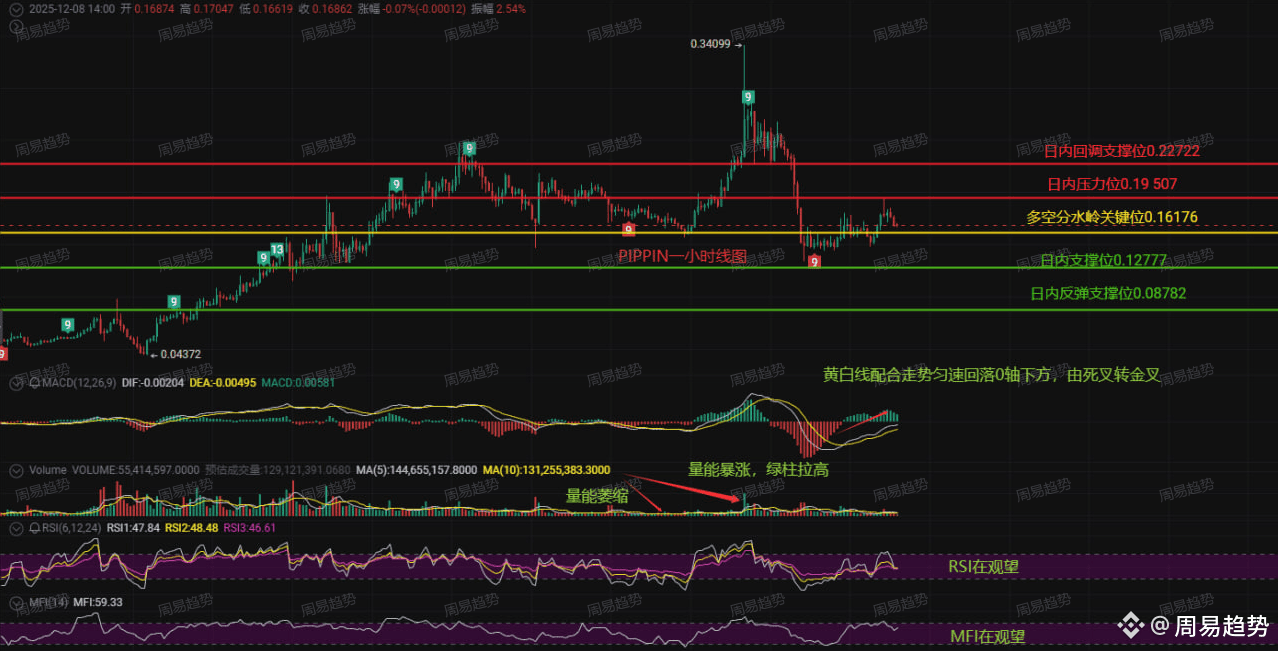 我是周易,刚才我盯着屏幕,眼珠子都快瞪出来了——PIPPIN这个妖币,一小时图MACD居然在0轴下死叉转金叉了!这到底是绝地反击的号角,还是庄家请君入瓮的陷阱?别划走,听我给你说透。
