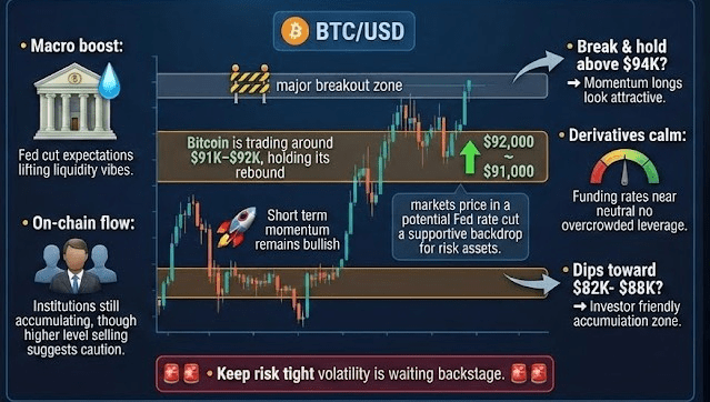 比特币的交易价格在$91K–$92K之间,保持反弹,市场预计美联储可能降息,为风险资产提供支持。短期动能仍然看涨🚀,但BTC仍在测试一个主要突破区间。🚧
