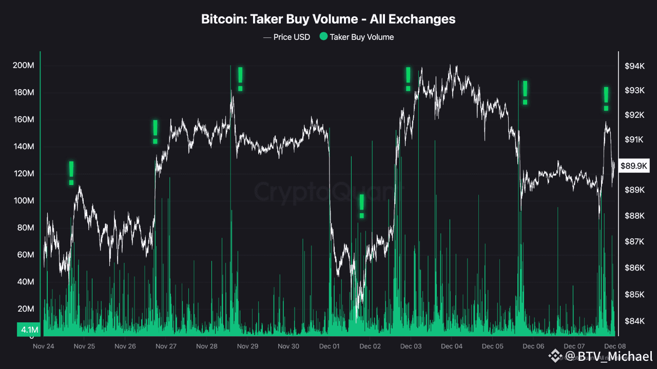 这两周的比特币像突然全网发起“抢货大赛”,吃单买盘量 Taker Buy Volume 不管涨跌都狂往上冲,动量盘追着买、巨鲸趁波动往里接,空头被逼着平仓,每次币价一急跌,绿柱子瞬间爆到天花板,市场的“跌了就扫货”心态直接拉满。最夸张的是,只要买盘一爆发,价格马上来个小反弹,感觉买方想重新拿回主导权。但问题来了,买得越来越猛,价格反而越走越慢,像是力气花出去了但没产生速度。这通常意味着市场深度变薄、买盘火力被分散,趋势开始累了。短线还能撑,但如果买盘继续“空转”,行情大概率要从“逢跌就买”走进“冲不动的疲劳期”。
