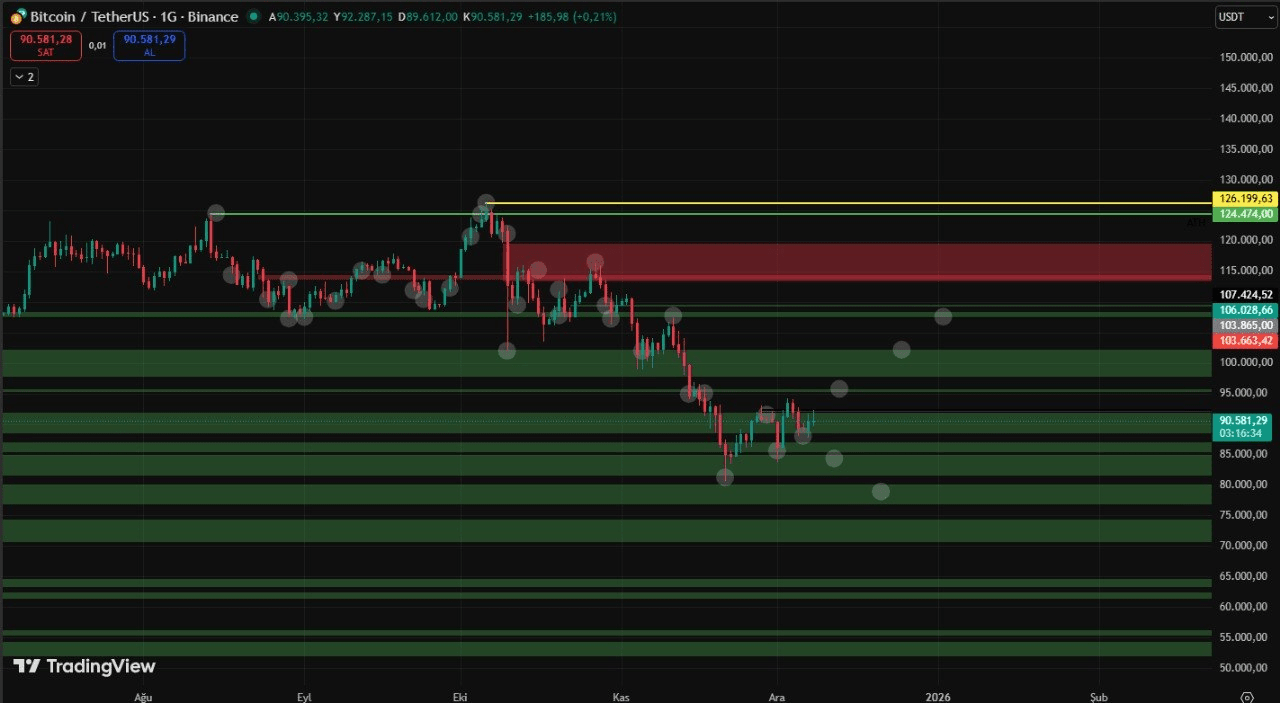 如果当前水平无法维持,图表突出显示86,000作为立即的防线。在其下方,80,000和75,000处出现更深的支撑层,这些区域在压力条件下历史上吸收了波动性。市场在这些区域的反应可能会决定持续修正的深度。