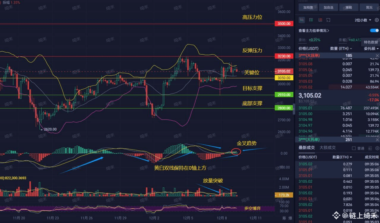 多空生命线:3105。现在的价格就在这附近晃荡,站稳了才能往上攻。