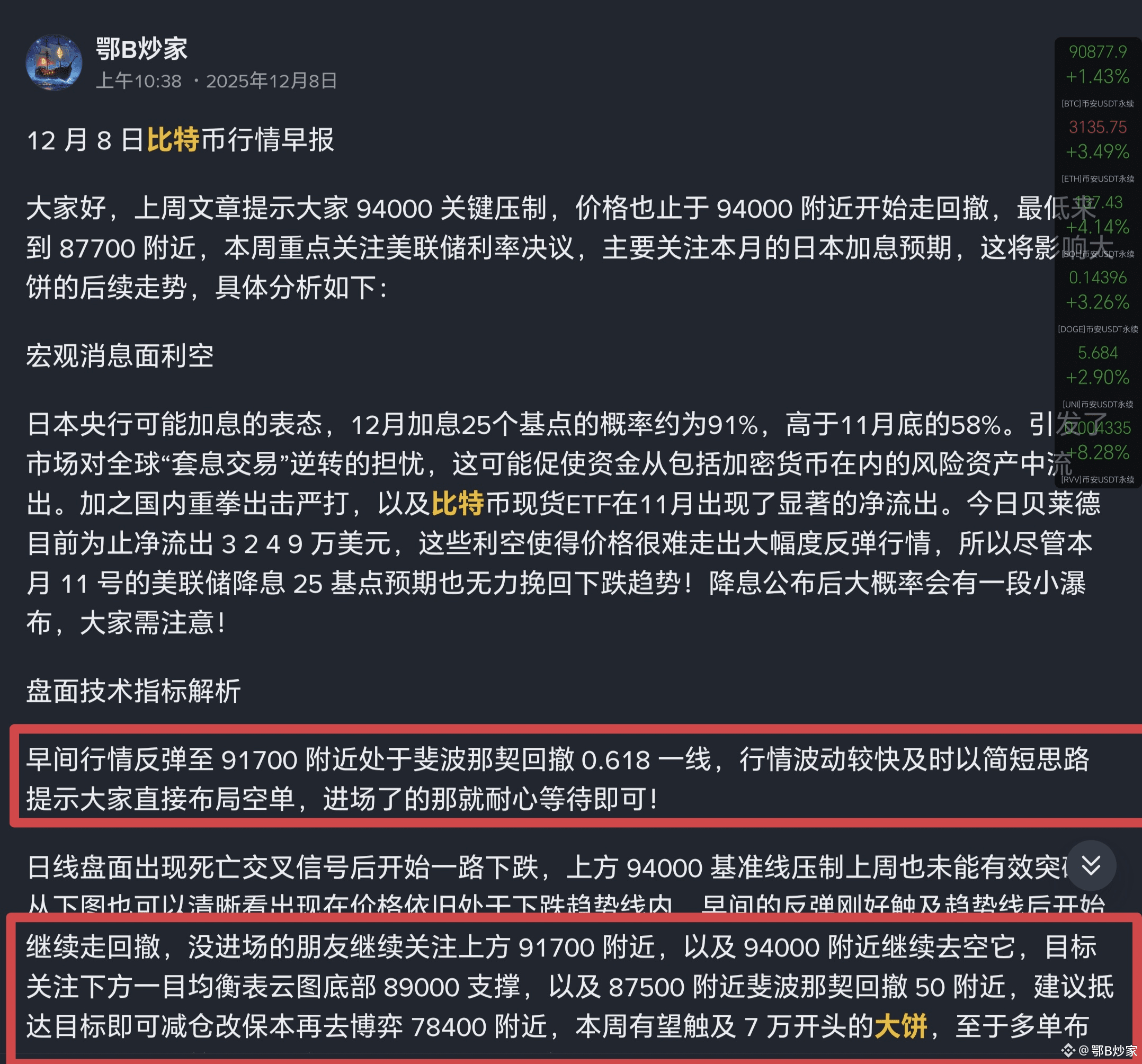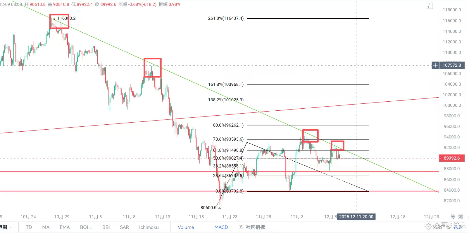 1. 对于持仓者:昨日在91700附近入场的空单,已在90000附近减仓后,可将剩余仓位继续持有,止损可上移至进场价附近。终极目标仍可看至83800-80600区域,甚至中期结构位78500。