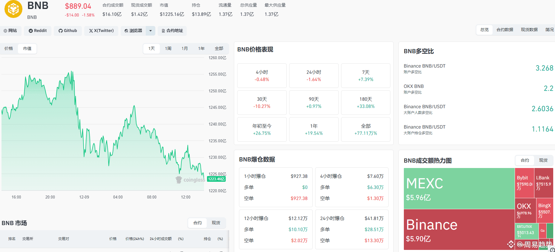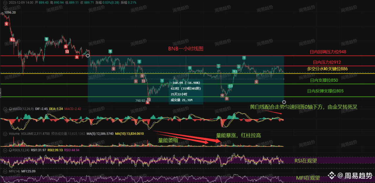 BNB一小时线出事了!刚才还在890美元附近挣扎,现在MACD死叉已露头,白黄线直奔0轴下方——这是要变盘!很多人问我:“现在还能拿吗?会不会直接砸穿800?”今天我带你盯紧盘面,把行情拆碎了看!