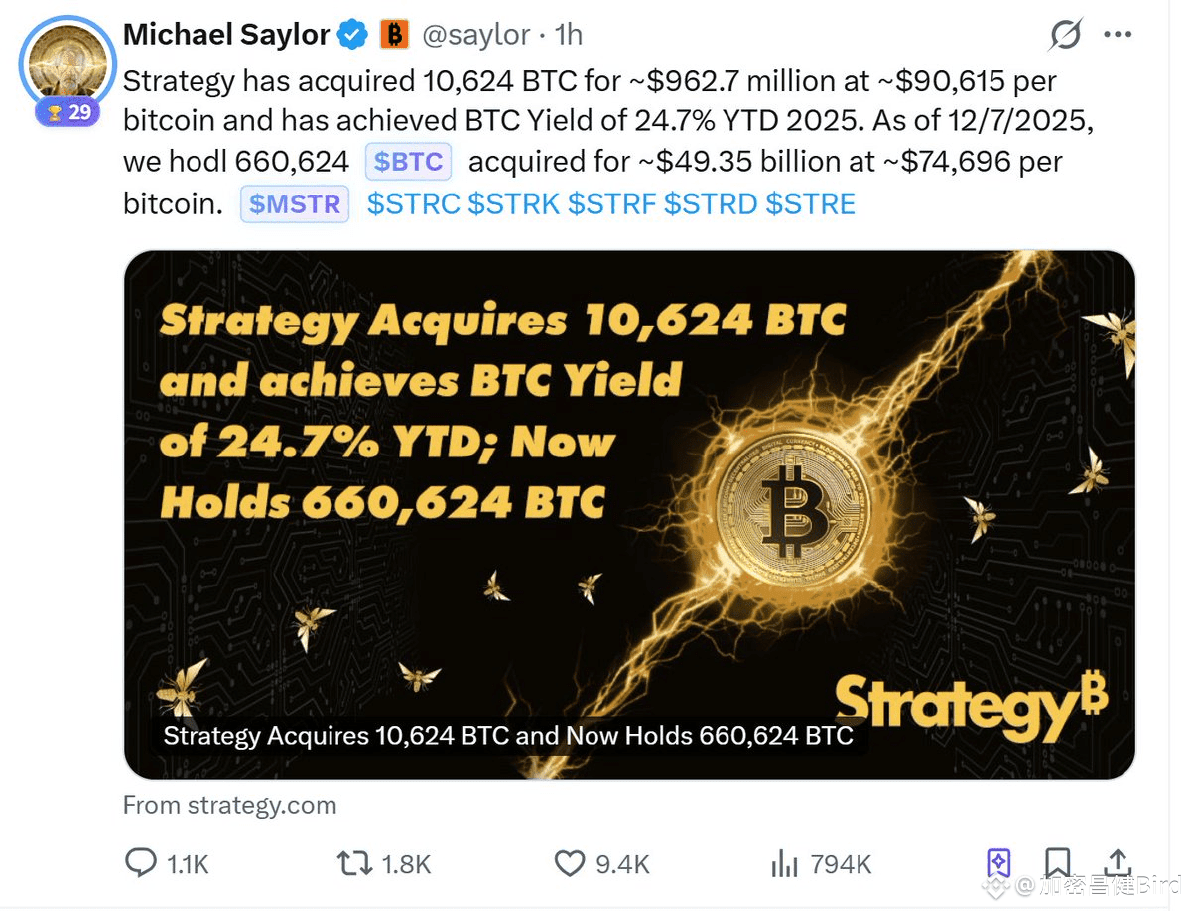 微策略又花了9.6亿美金买了10624枚比特币,平均买入价90615美元,总成本均价74696美元,目前浮盈104.73亿美元。