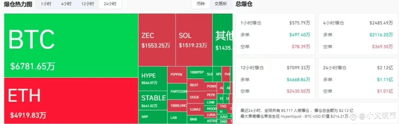 过去24小时,加密货币市场在宏观审判日来临前上演了高波动性剧本:全球共有85,716名交易者遭遇爆仓,爆仓总金额高达2.12亿美元,其中最大单笔爆仓单来自Hyperliquid平台的BTC-USD交易对,价值214.21万美元。