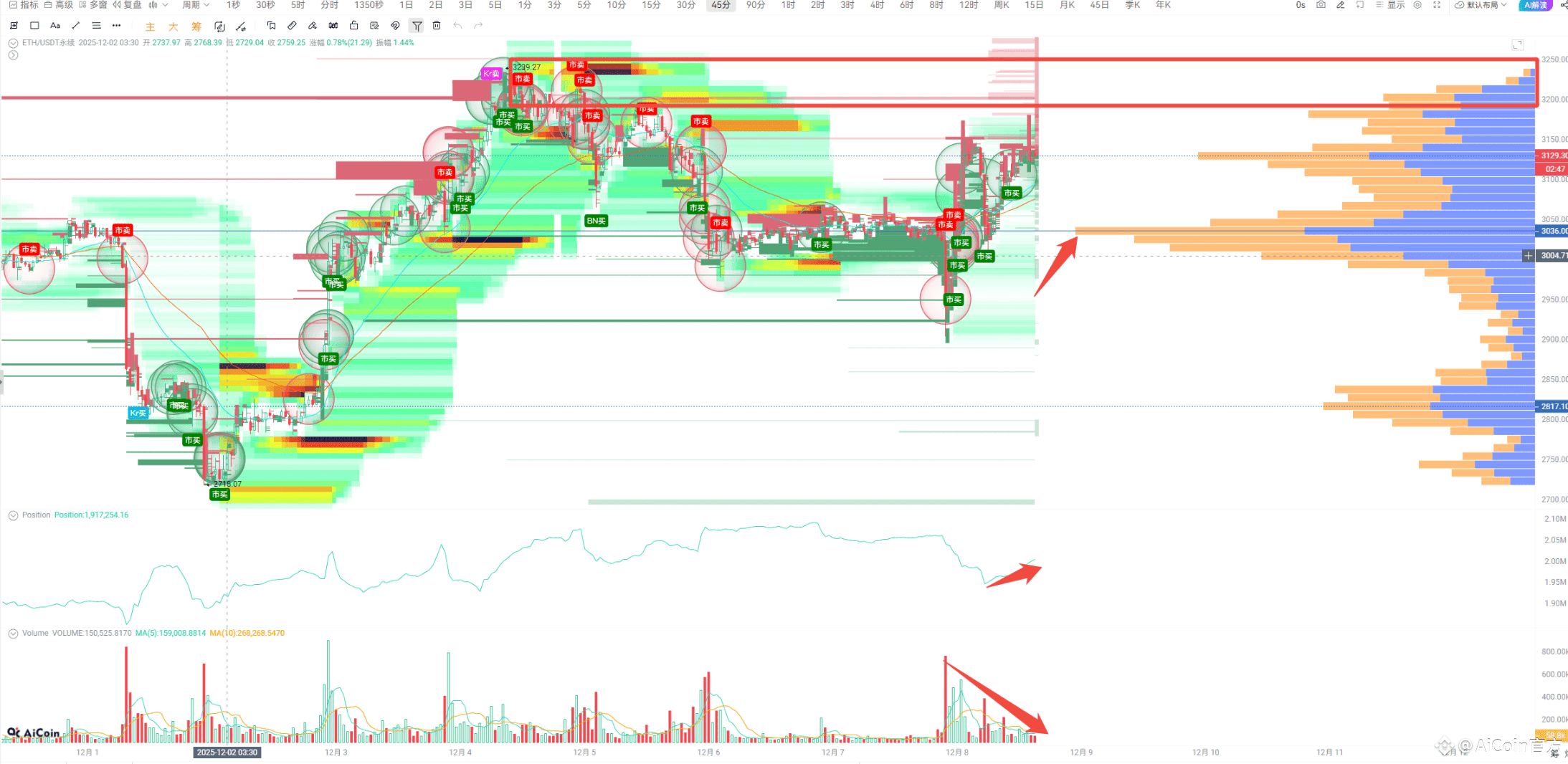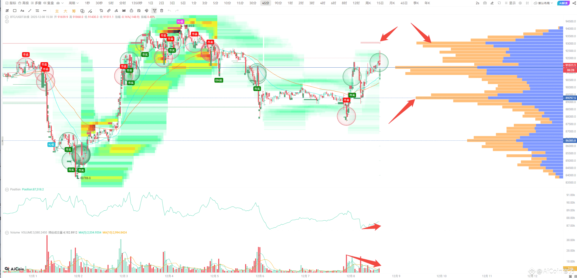 BTC45 分周期里,持仓量虽然在涨但涨得磨磨唧唧,成交量还跟价格走势拧着劲儿(背离)。