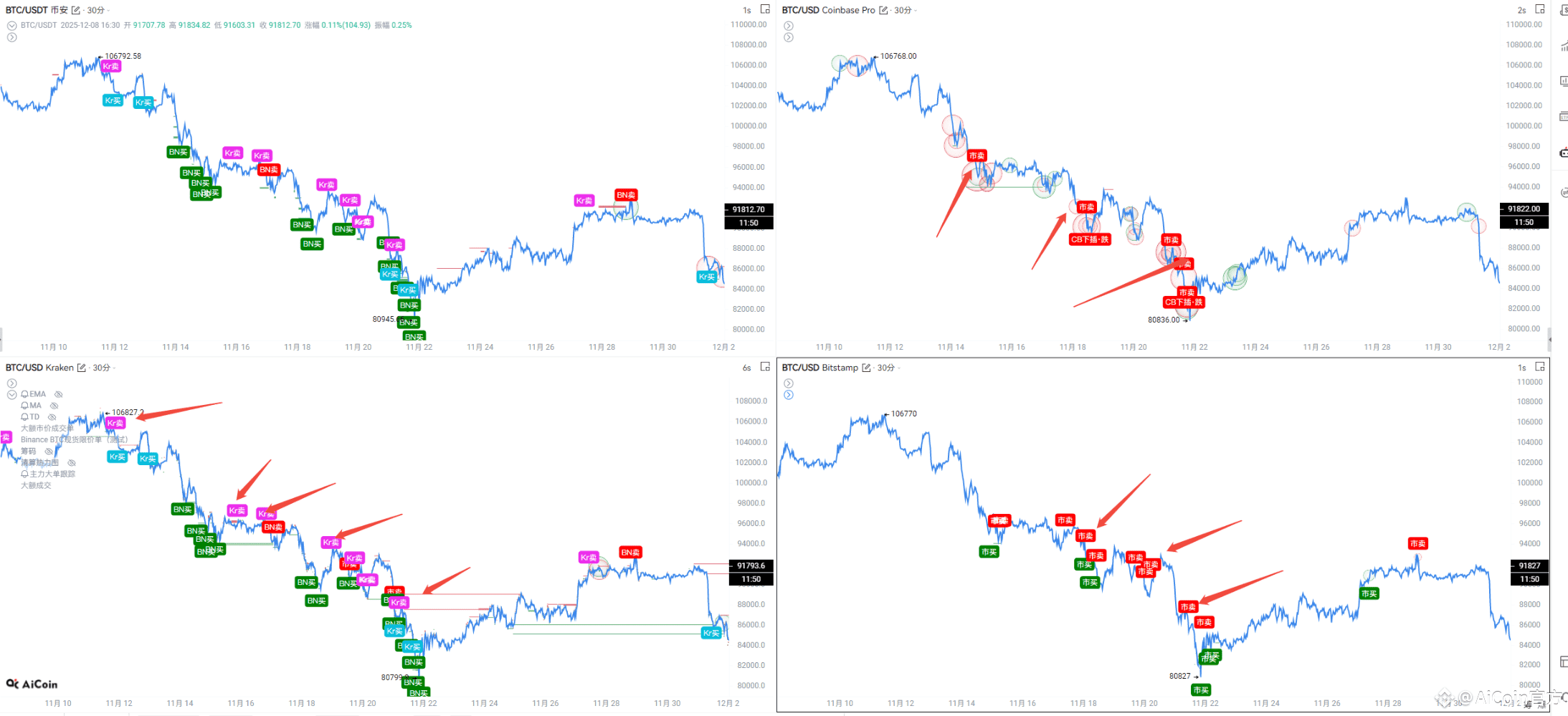 总结一下:下跌的时候,要是看到币安出现大额护盘买单,得先确认 Coinbase、Kraken、Bitstamp 这几个平台的主力有没有停手卖;要是币安 BTC 突然猛涨猛跌,也得看看这几个平台的主力有没有跟着动 —— 没消息没成交量配合的话,单靠币安的动作可不算数