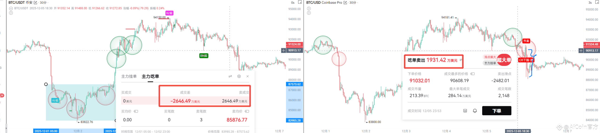 哪怕是三笔大单,威力还不如 Coinbase 上一笔大单 —— 比如 Coinbase 那笔 1931 万的市价单,直接带得价格波动超 3%。这差别,就跟主力的据点有关。