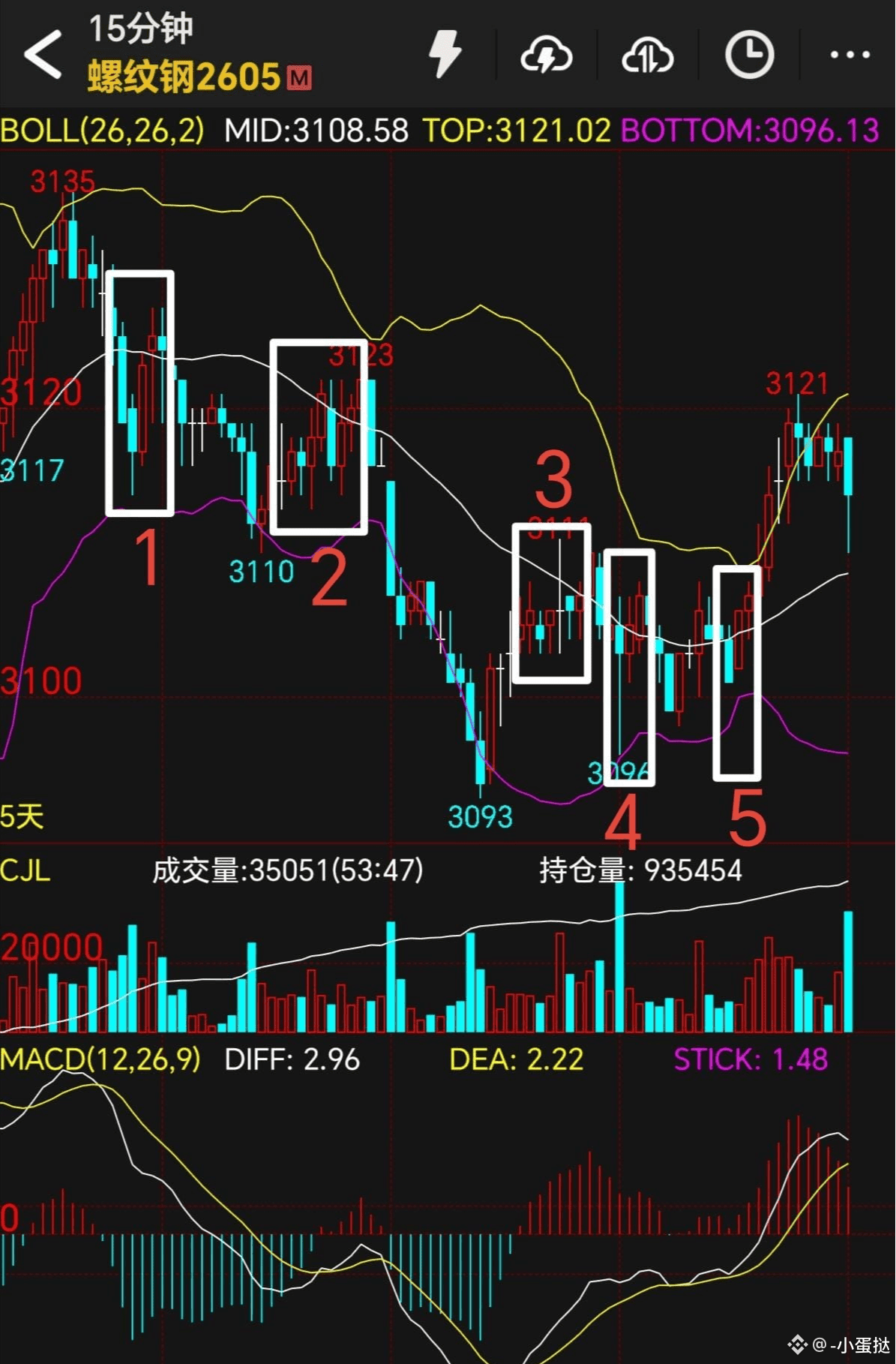 比如就做螺纹钢,做多。5分钟图上加上默认参数的布林带,和MACD。