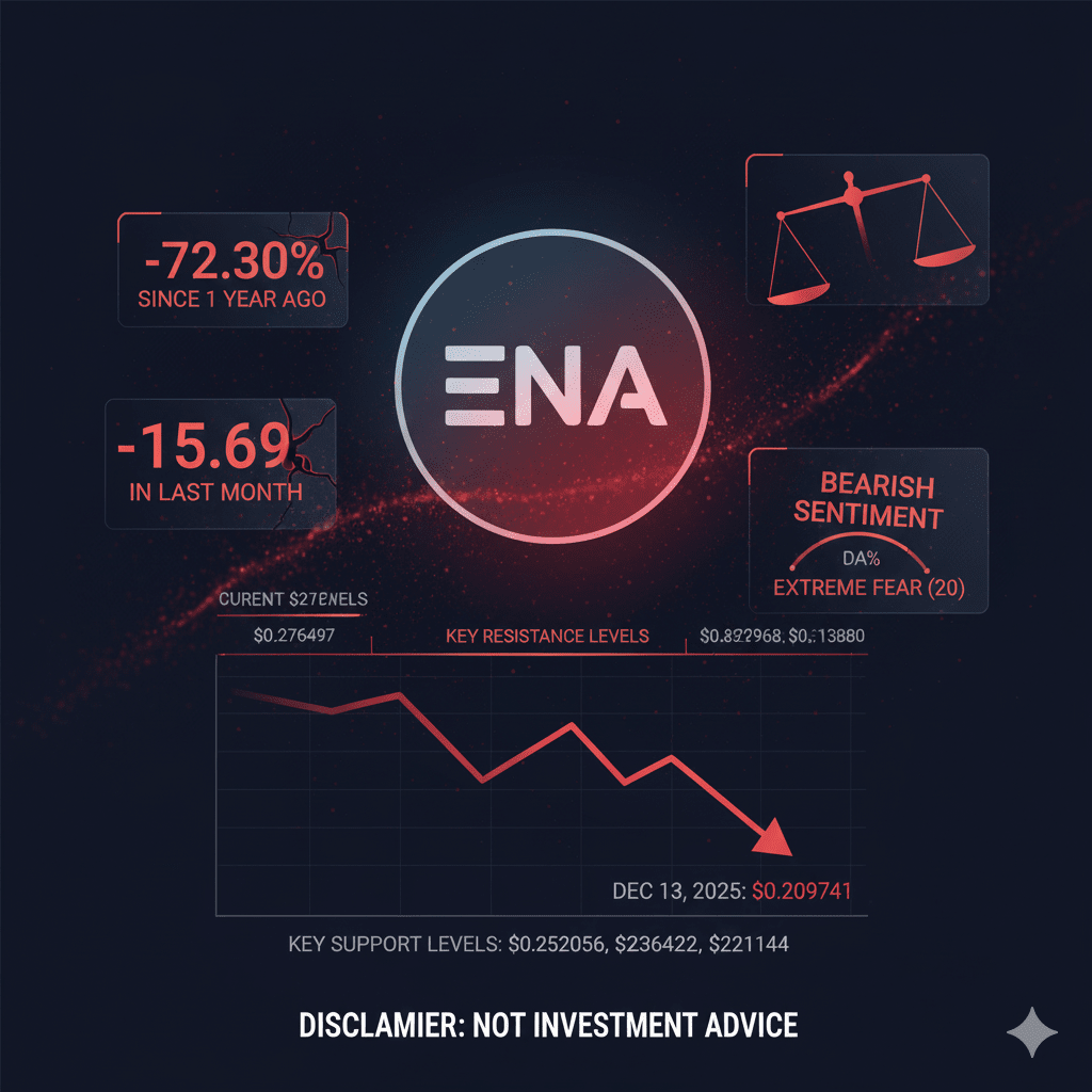 短期预测:尽管近期日常上涨,但 ENA 的市场情绪依然看跌。市场分析预测在接下来的五天内将下跌约 22.72%,预计到 2025 年 12 月 13 日价格将跌至 $0.209741。