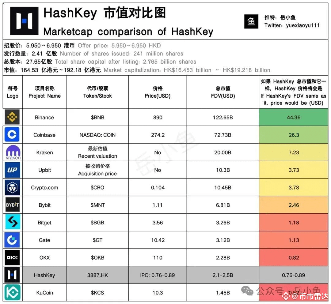 目前KuCoin的平台币 $KCS FDV是14.5亿美元,如果 HashKey 总市值和它一样,HashKey 价格将会是0.52美元。