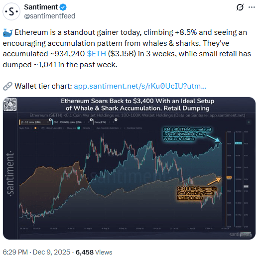 根据Santiment的链上数据,大型和小型以太坊持有者之间出现了明显的分歧。
