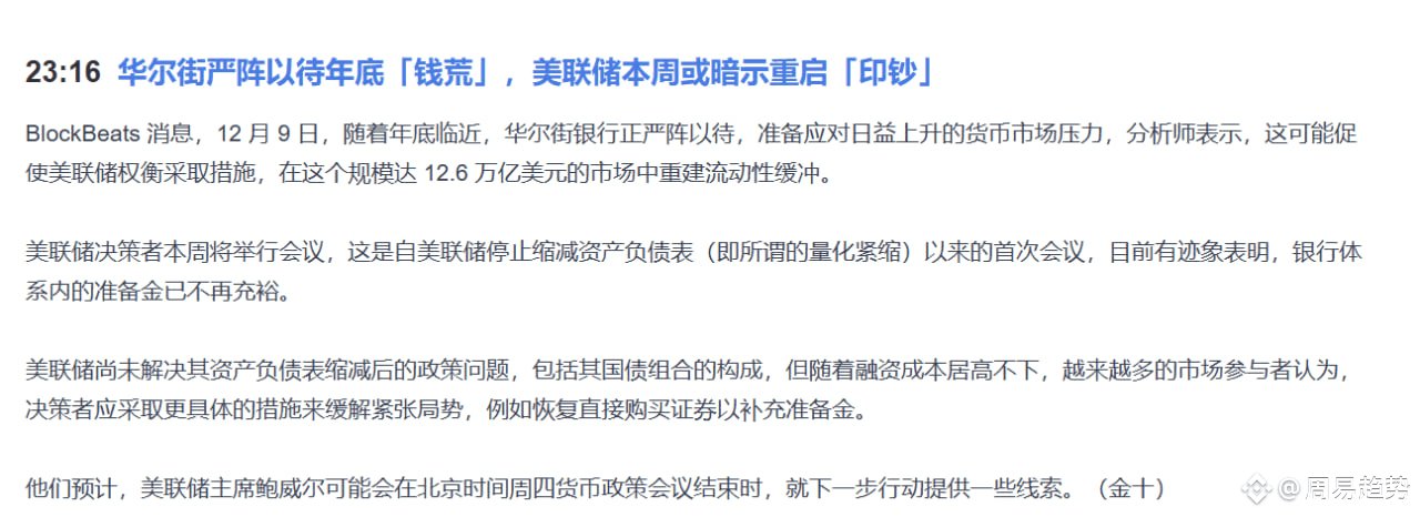 昨晚华尔街传来消息,美联储可能被迫重启“印钞”,应对年底钱荒。这本来算是流动性利好,但注意——市场往往“买预期卖事实”。尤其当前SOL已处于超买区,利好落地可能反而成为大户出货的借口。流动性缓解需要时间,而技术面的回调压力,已经近在眼前。