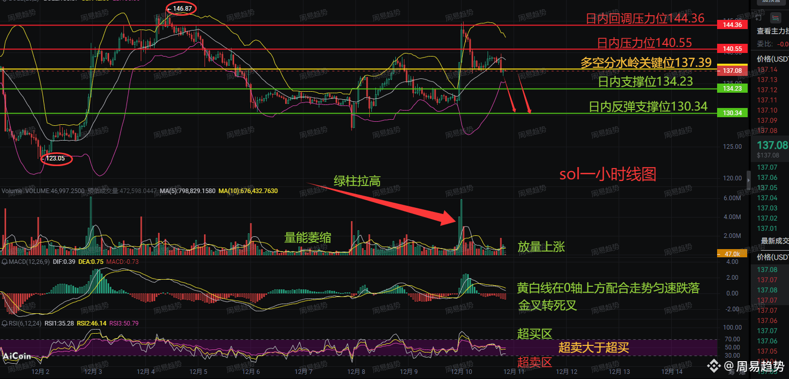 下方关键位置:137.39是多空分水岭,跌破这里,短期趋势转空,大概率会测试134.23支撑,甚至砸到130.34强支撑才会出现像样反弹。