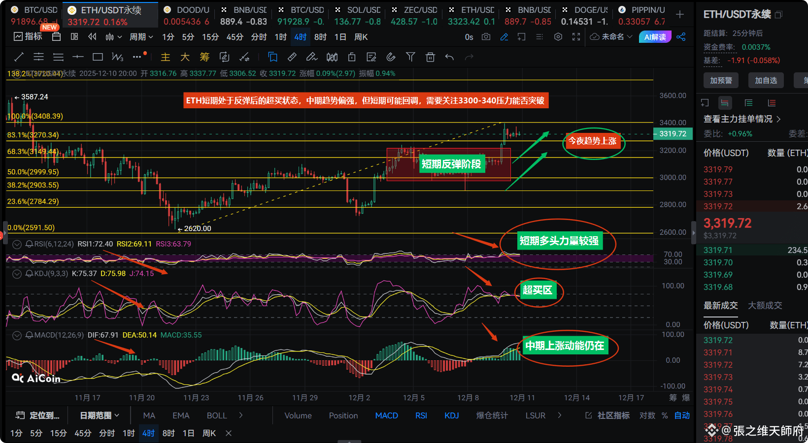 但有个事儿我得泼盆冷水:现在的 ETH,已经有点 “涨得急眼” 了。你们看 4 小时图的 RSI,直接干到 72,KDJ 也顶到超买区 —— 这就像你跑百米,前五十米用了博尔特的速度,后五十米要么减速要么摔跟头。我上午在 3350 附近让社群里的老粉减了三成仓,不是看空,是 “急涨必回调” 的老规矩:昨天从 3100 冲上来没歇脚,现在卡在 3300-3350 的压力位,机构不可能一直硬拉,肯定得砸下来吸点便宜筹码。