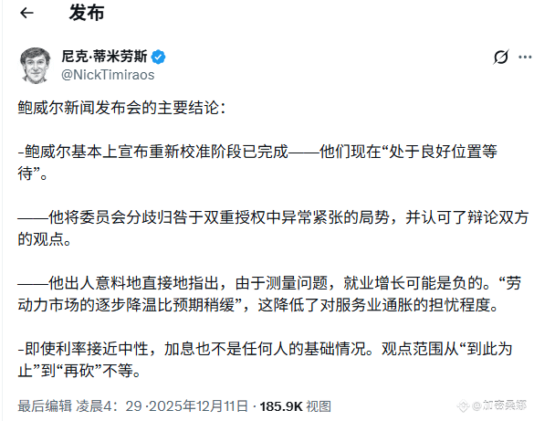 美联储现在位置不错,2025 年政策调整阶段快结束了,以后不会按预设路线来,全看经济数据。