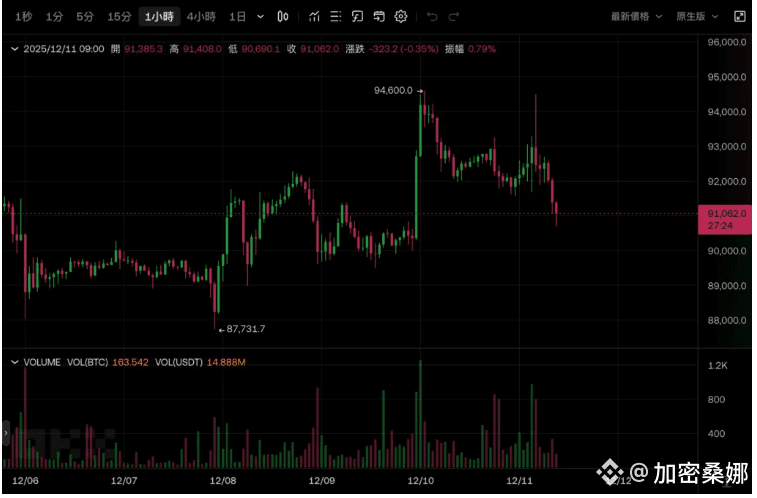 消息刚公布,比特币直接旱地拔葱冲到 9.4 万美元,本以为要开启暴涨模式,结果卖压跟不要钱似的涌出来,不仅留下一根长长的上影线,还一度跌破 9.1 万美元,现在报 91062 美元。
