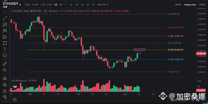 ETH 这波反弹太会卡点了,正好顶在斐波那契 0.618 的 3446 阻力位,一点没超预期。结合 BTC 的下跌预判,ETH 的反弹基本凉了,接下来跟着主流币一起开启下跌趋势,别抱有幻想!