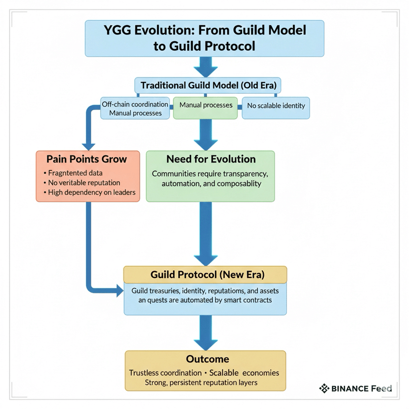把旧的公会模型想像成一个通过群组聊天和社区经理协调的俱乐部。它运作良好——但它并不是无信任的、透明的,也不是真正可组合与新兴的 Web3 工具。YGG 和它的公会协议现在所建立的更像是一个链上身份和协调层,适用于各种社群,而不仅仅是游戏玩家。