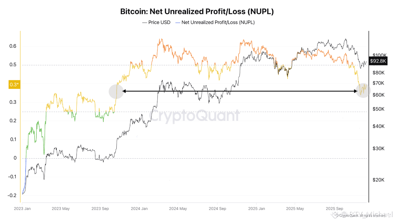 比特币的净未实现盈亏比率 NUPL 一路滑到 0.39,看上去像“哎呀完了要凉”,不过仍处于“整体赚钱区”,说明大多数人根本没想卖,筹码抓得比谁都稳。历史上这个区间从来不是“崩盘信号”,更像是大户戴墨镜悄悄补仓的再积累阶段。不过当前行情正卡在牛熊交界的尴尬位置,不上不下,大家都在等剧情反转。趋势没扭头前,加仓要稳,风险得先放第一位,不然震荡随时给你来个下马威。回顾过去周期,只要 NUPL 落在这样的“低但不慌”区间,多数时候都是不错的中期布局点,而不是该狂奔逃离的时刻。说白了,现在更像市场装死洗耐心,而不是吓你跑路;真正要避免的,是被这一段无聊震荡骗下车。