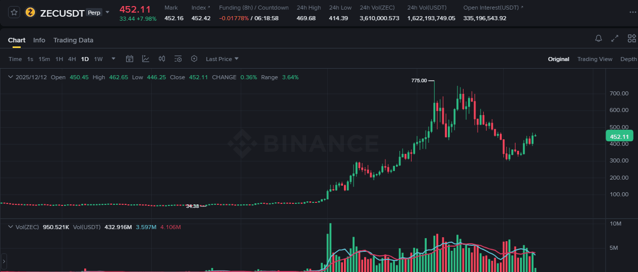 $ZEC 再次引起了很多关注,因为价格动能和交易量激增。反弹回到$450以上表明资金正在转向隐私币,而ZEC是目前最大的受益者之一。