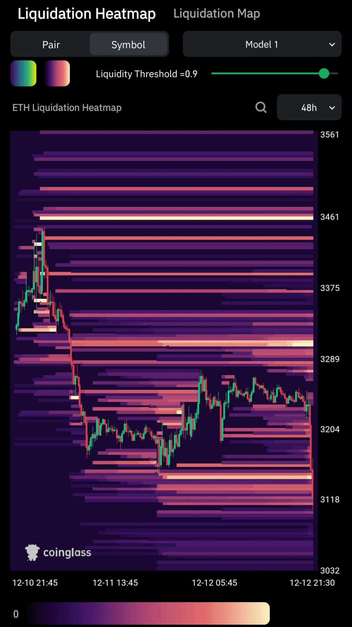 市场扫荡了我们下面的所有流动性(截图 2)。现在底部基本上没有剩下什么。因此,我放大到更高的时间框架(截图 3),显示出大约 $3300 和 $3461 周围有一个巨大的流动性口袋。