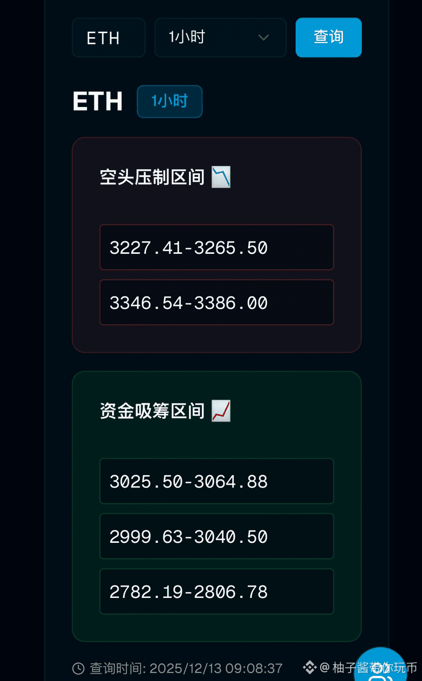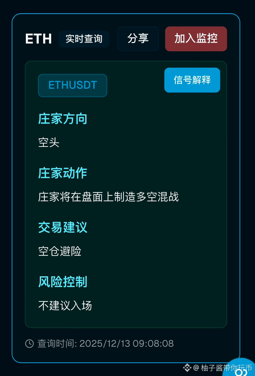 $ETH 早上好!哥哥们,2025年12月13日早上,ETH还在3200-3300区间打游击战,看似多空拉锯,实则庄家空头控盘!监控信号直球:庄家方向空头,动作“盘面制造多空混战”。