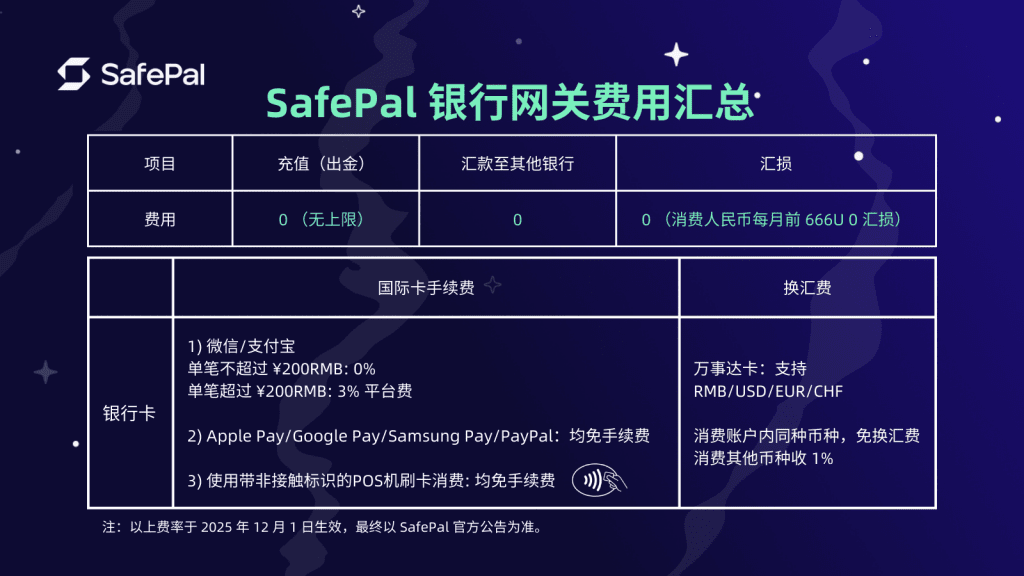 目前SafePal 重磅升级:充值不限额 0 手续费,再送人民币消费每月 666U 额度汇损补贴