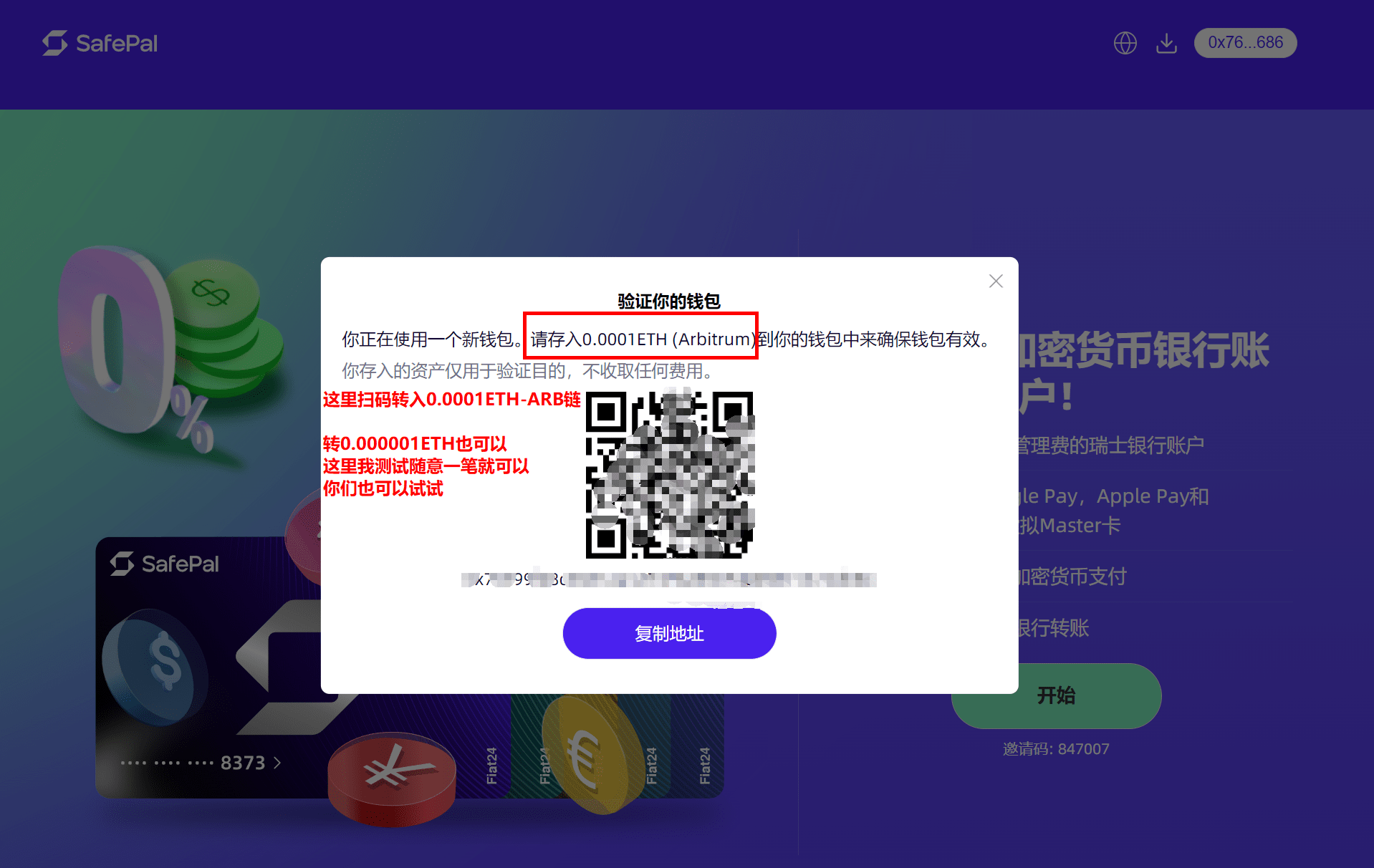 任意充值一笔ARB链的ETH即可、上面显示为0.0001ETH,我自己测试任意金额就可以,直接到safepal钱包里面了,钱还是自己的,不用担心!