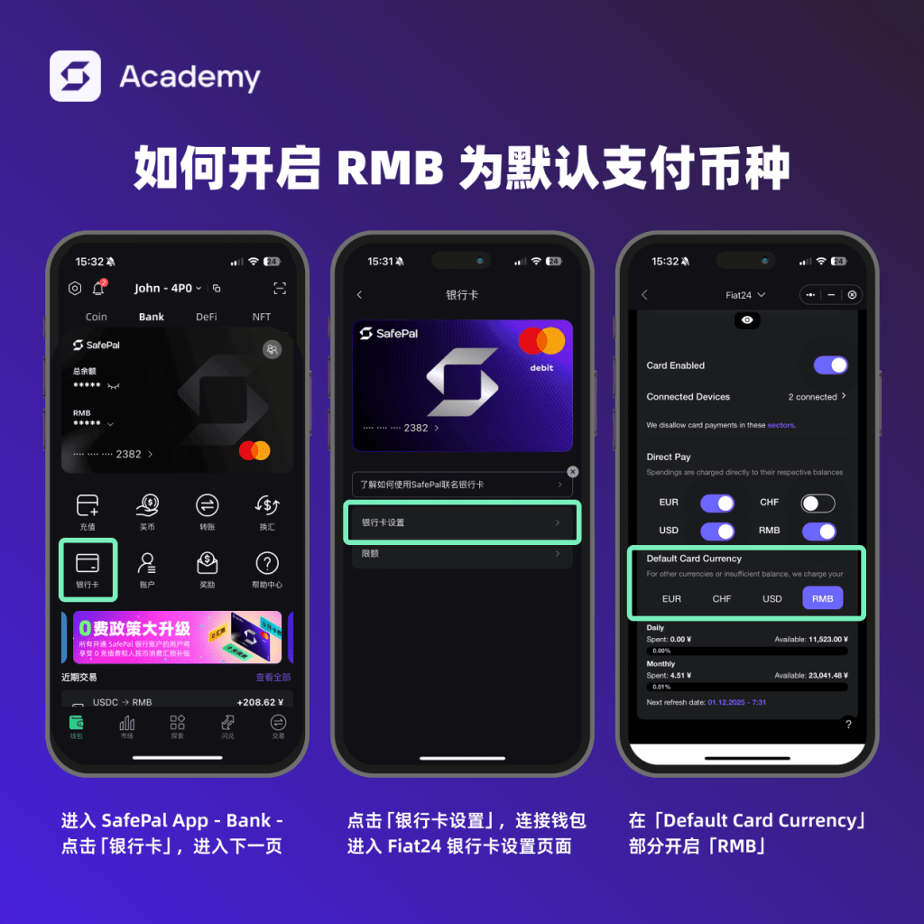 为了更方便地享受此福利,用户可在充值时选择充值至美元或人民币,并在银行账户的卡设置中将默认支付账户设置为美元或人民币,在消费人民币时,即可享受 SafePal 提供的汇损补贴。