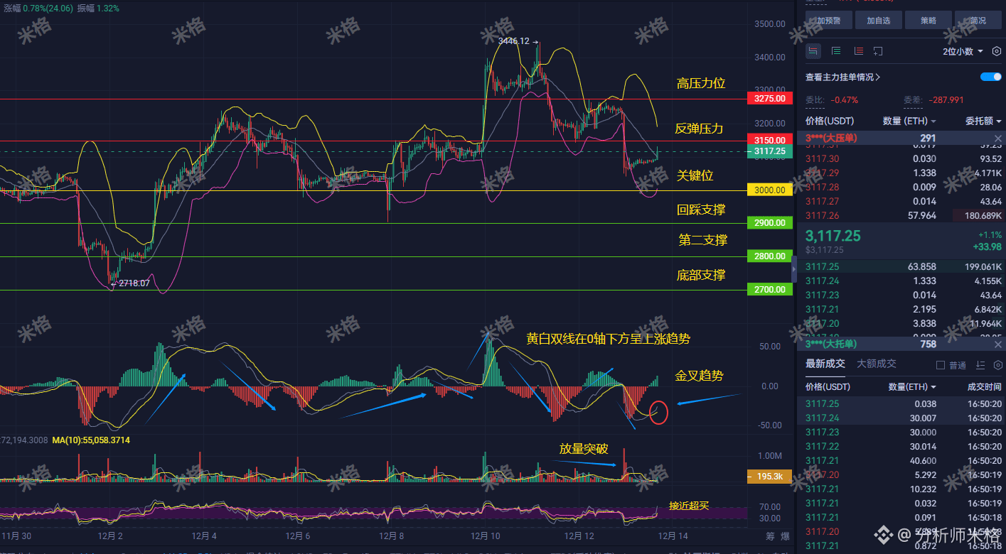 ETH现在慢慢往上蹭,已经冲过3100了,下一站是3150。图上看,MACD两条线在0轴下面往上翘,像要金叉,这确实是个反弹信号。