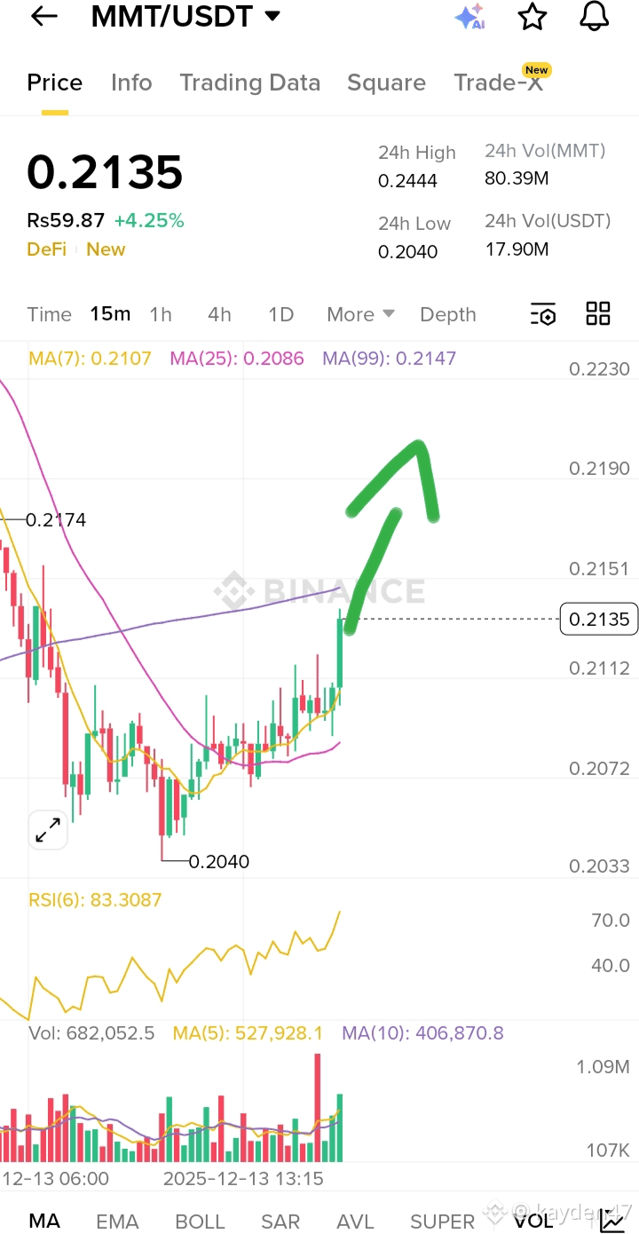 Is chart ke mutabiq MMT/USDT market is waqt clearly bullish momentum show kar rahi hai. Price $0.2135 ke aas-paas trade kar raha hai aur strong buying pressure nazar aa raha hai. Short-term moving averages (MA 7 aur MA 25) upar ki taraf cross kar chuki hain, jo trend reversal aur continuation ka strong signal hota hai.