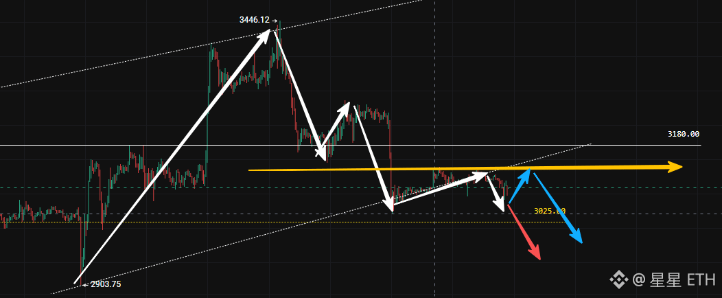 现在的盘面,垃圾时间,没啥可讲的,3050-3140的窄幅震荡。蓝色路线碰到黄色箭头3140附近下来,或者往下去找3050附近的支撑。红色路径直接下来。