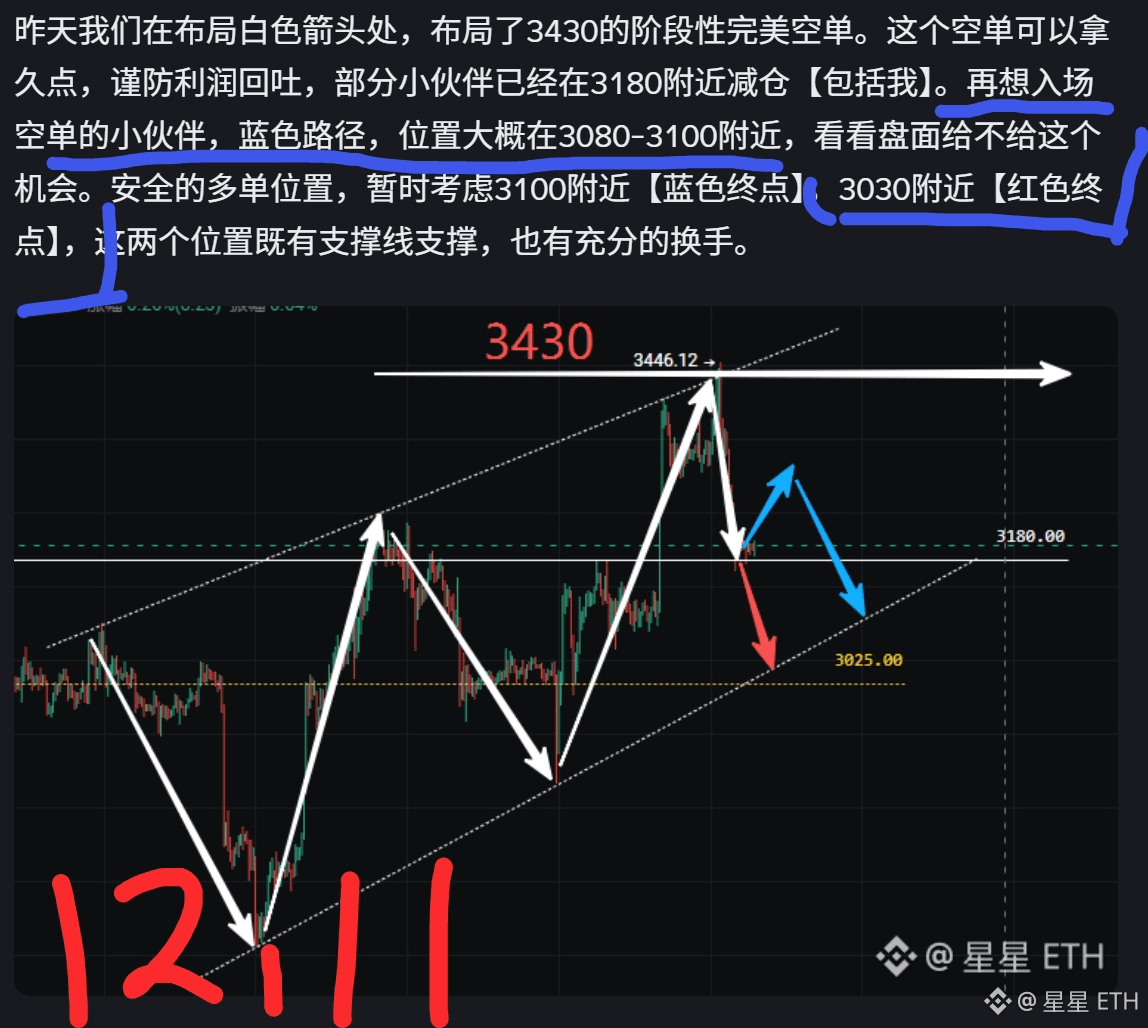 首先11号我们的分析中说再入空单看蓝色路径那个位置,大概3280-3300附近【手误打错了,但图没错】,这个位置盘面是给到的。多单的位置3100损掉(实际上,当时在盯盘,这个位置没有让大家接多),3030附近的多没给到,但我们在3068附近接了多,并且在3127的好点走掉。这两个单子都在广场上,我有发。