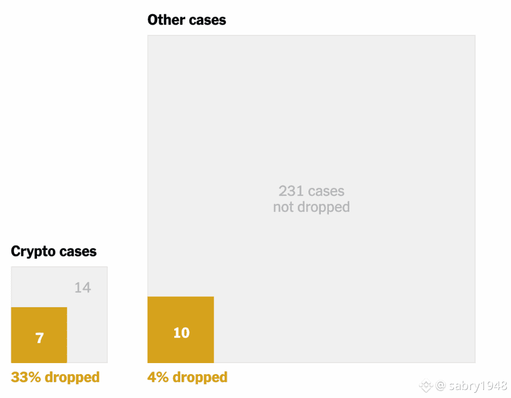 وفقاً للتحقيق، الذي اعتمد على تحليل قاعدة بيانات شاملة لإجراءات الإنفاذ من الإدارات الثلاث الأخيرة، تراجعت الهيئة عن أكثر من 60% من القضايا المتعلقة بالكريبتو التي كانت قائمة عند تولي ترامب المنصب. من بين 23 قضية موروثة من إدارة بايدن، تم التراجع عن 14 قضية (حوالي الثلث)، مقارنة بنسبة إسقاط لا تتجاوز 4% في القضايا المتعلقة بقطاعات أخرى. كما أسقطت الهيئة سبع قضايا تماماً، وجمّدت أو خففت أو اقترحت تسويات ميسرة في سبع قضايا أخرى.