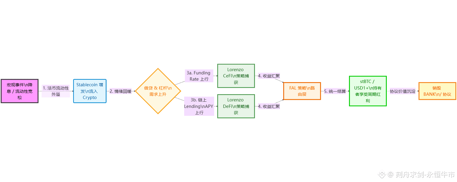 Lorenzo Protocol 给出的答案,是一套“宏观流动性 → 策略收益 → stBTC 利率”的传导链: