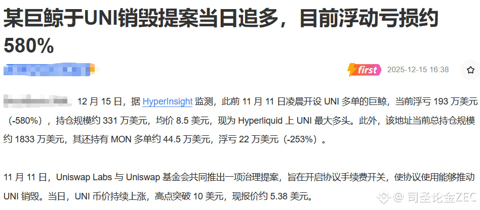 某巨鲸在UNI发布重磅销毁提案的当天凌晨冲进去追多,结果被套在8.5美元的山顶,现在浮亏580%!。(MISSING)这故事告诉我们什么?在币圈,“买在预期,卖在事实”是铁律,当所有人都知道的消息,往往就是找人接盘的信号。 这条巨鲸亏的不仅是钱,更是为“FOMO情绪”支付的天价学费。
