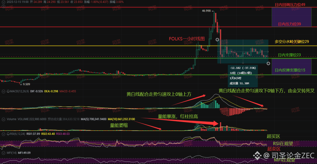 价格卡在“尴尬位”:收盘 23.853,正好悬在多空分水岭 29 和日内支撑 23 中间。往上,39、49 两大压力位像两座大山;往下,23 是短期生命线,破了就容易滑向 15。
