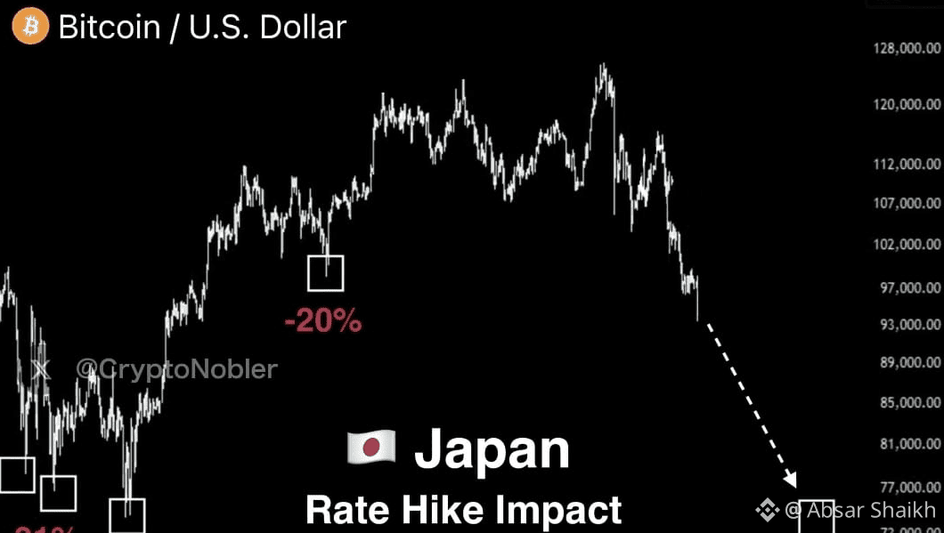 تاریخی طور پر، جب بھی جاپان نے شرح سود میں اضافہ کیا ہے، بٹ کوائن نے تیز کمی کا سامنا کیا — عام طور پر 20–25٪ کے درمیان۔ یہ پیٹرن اتفاق نہیں، بلکہ عالمی لیکویڈیٹی کی حرکات پر مبنی ہے۔
