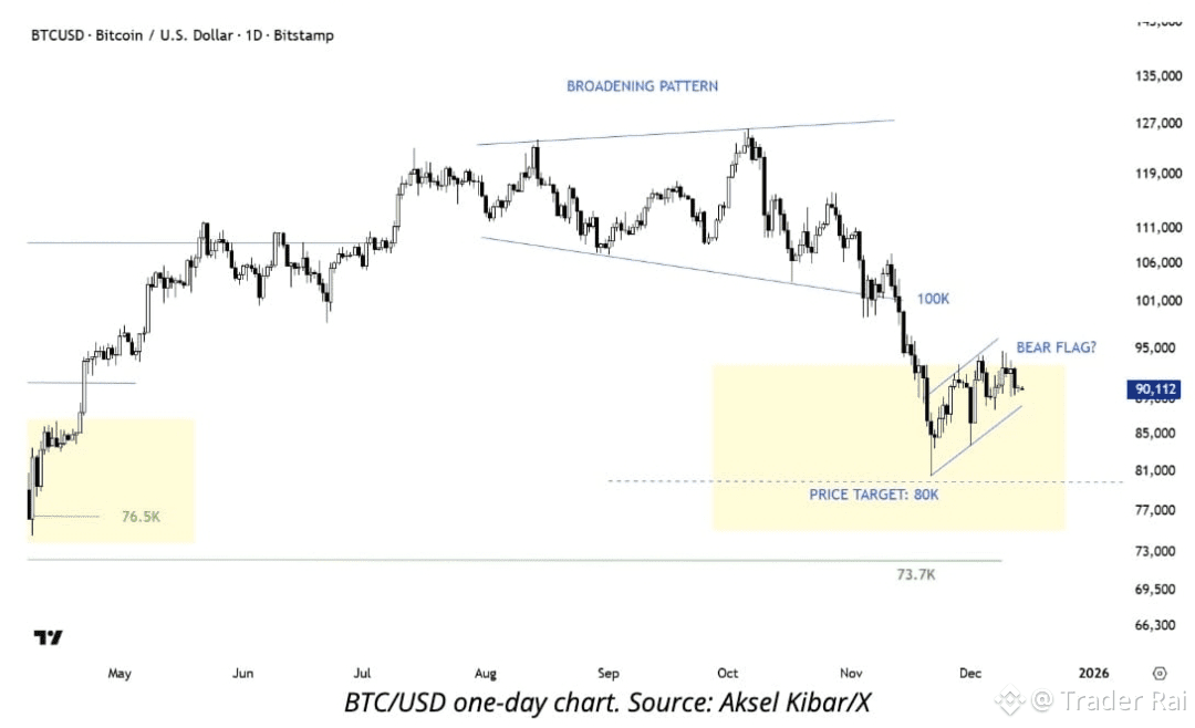 According to technical analyst Aksel Kibar, Bitcoin’s chart structure now presents two dominant scenarios. The first is a continuation lower, driven by what appears to be a bear flag formation on the daily timeframe. If this pattern plays out fully, BTC could see another leg down toward the $73,700 to $76,500 region, an area that previously acted as strong demand and may serve as a medium-term bottom. The second scenario requires a decisive reclaim of the $94,600 to $95,000 zone, which would invalidate the bearish setup and potentially open the door for a rapid push back toward $100,000.