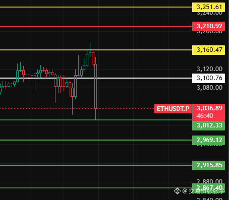 以太夜间留意3100这个位置,反弹不上此位置反弹没有力度,再次下跌就看刚才前低3012附近,不破小级别依旧会反弹,破了那下方支撑位留意2970-2915-2867这几个位置附近!