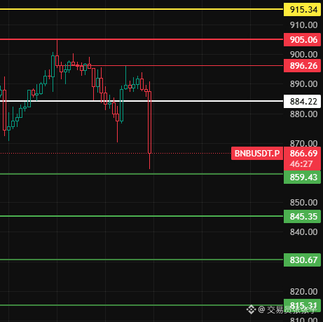 夜间反弹只有站稳884上方反弹力度才大,上方压力位在看896-905-915这几个位置附近!#BNB走势