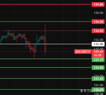 SOL夜间留意131这个位置,反弹不上此位置反弹没有力度,再次下跌就看刚才前低127附近,不破小级别依旧会反弹,破了那下方支撑位留意125-123-121这几个位置附近!