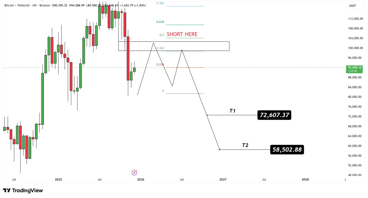 比特币正在接近0.382和0.5回撤水平之间的关键斐波那契汇聚区,这个区域之前一直作为强大的阻力。这一区域通常吸引大量的卖压。如果价格出现假突破后随之被拒绝,可能会触发中期修正。如果空头在这里介入,市场结构支持下行持续的可能性。交易者在进入仓位之前应该密切关注这一区域的价格反应和确认信号。