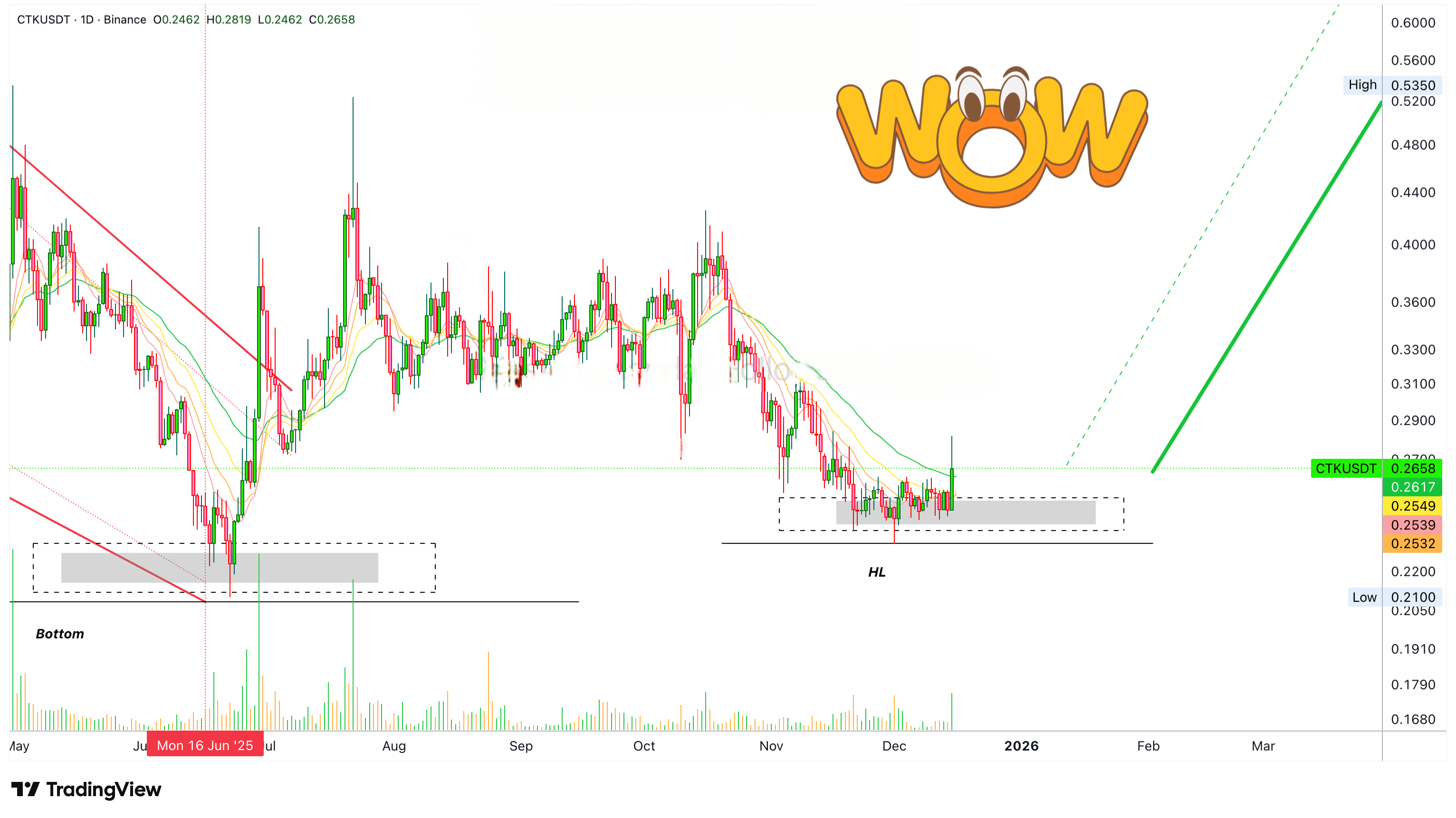 我们可以看到CTKUSDT在一天内超过了四个移动平均线:EMA8、EMA13、EMA21和EMA34。我们还出现了一个“成交量突破”。这意味着今天的成交量是几个月以来最高的。在买方方面,我们很可能今天的成交量是自六月以来的最高。一个大绿色蜡烛。一个确认的看涨突破。