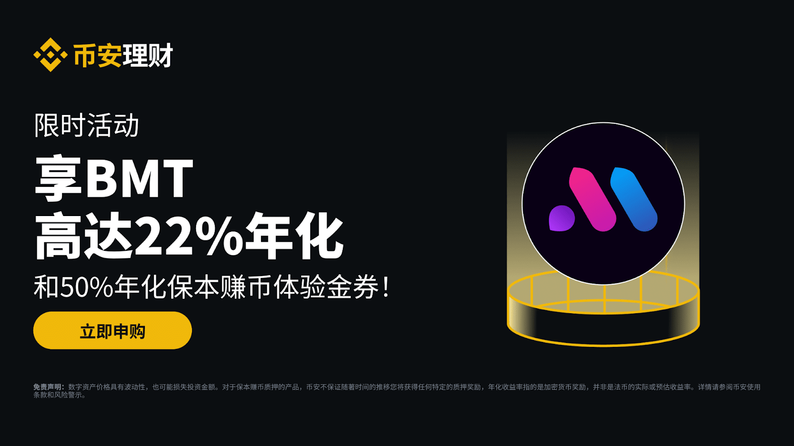 币安保本赚币平台推出BMT保本赚币产品双重活动!活动期间,申购BMT活期产品的用户,可享受实时年化收益以及20%阶梯年化收益率。